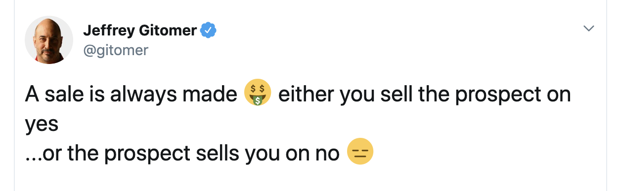 I learned that from Jeffrey Gitomer, one of the great authors on selling. He says, “the sale is always made.”